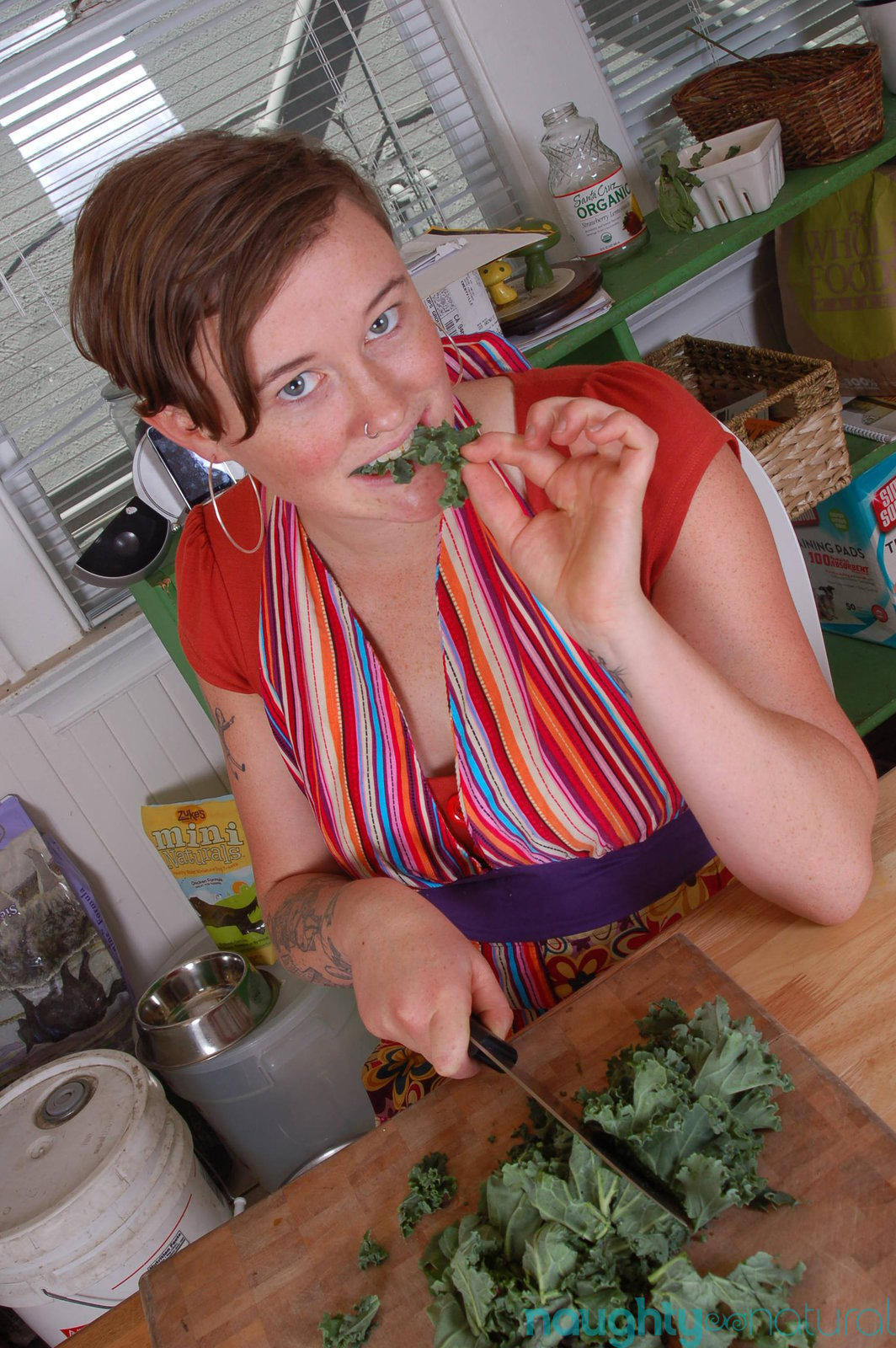 In this adorable photo set, Annie starts out in an apron, chopping up some kale, straight from the home garden! Then she gets naughty and gets into some kitchen fantasy stuff, wearing just the apron and flashing her meaty, hairy pussy lips! Join now to see all 102 photos in this scene!