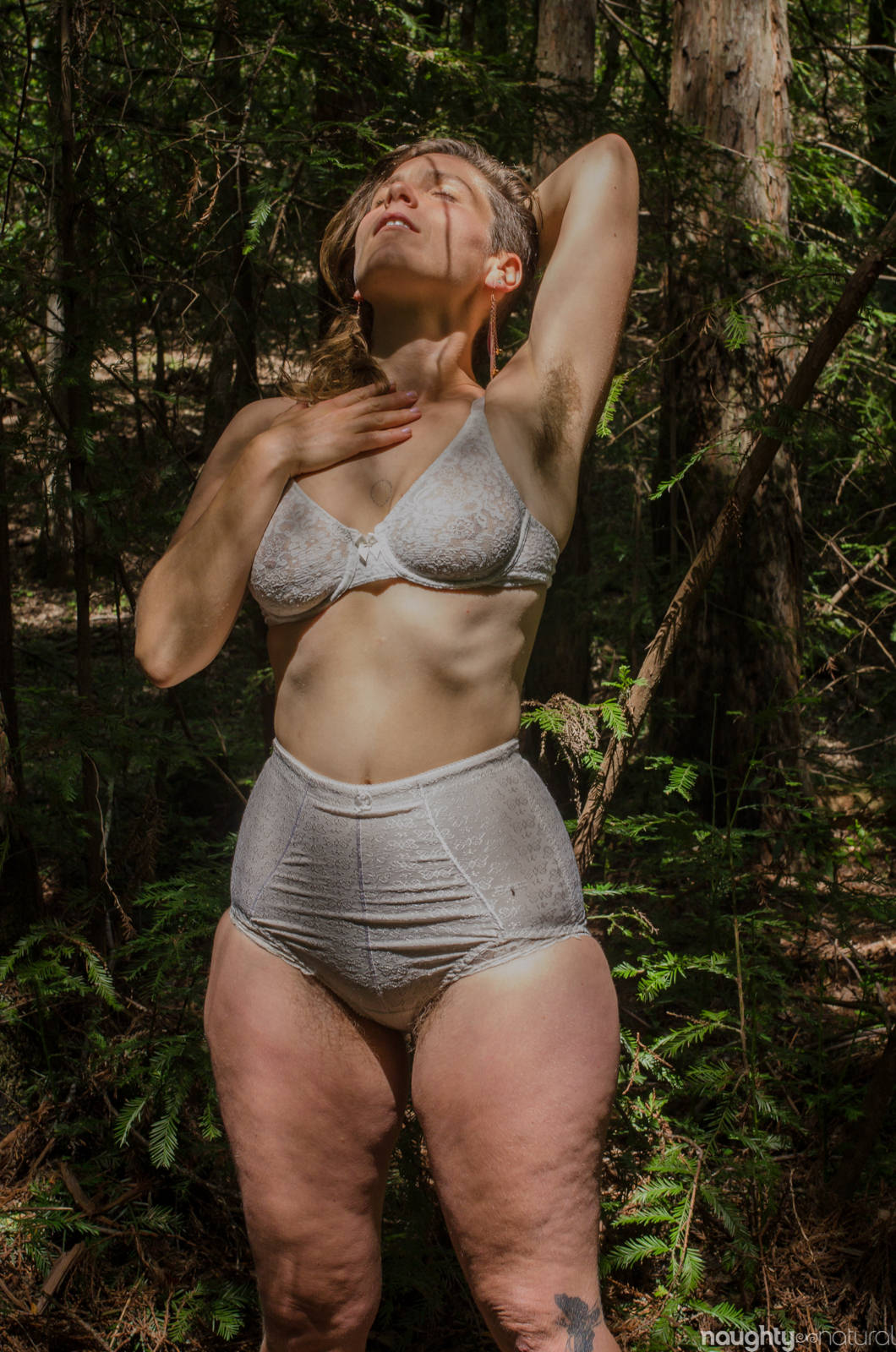 I love this very vintage feeling set so much. Welcome back to the 70's with Cookie in an embroidered shawl, with her wide hips and untouched, natural body. Her high waisted panties and bra make her look like she's from another time, enjoy this set of her risrobing in the redwoods. Join now to see all 148 photos in this scene!