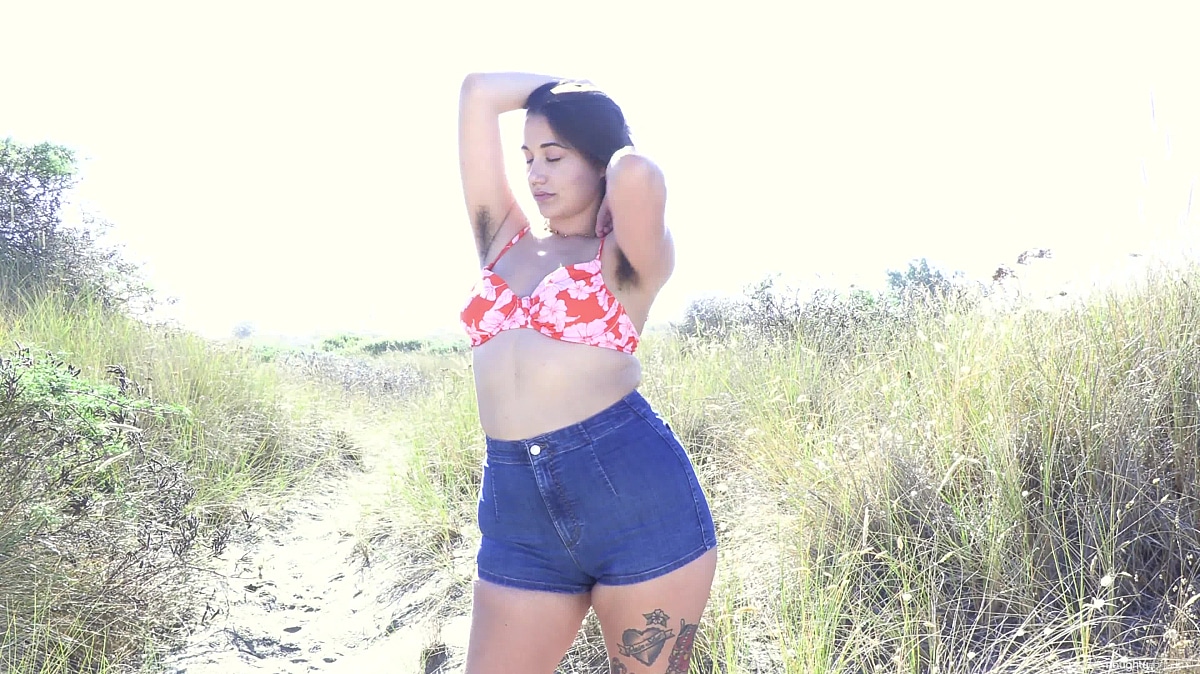 Beautiful, tall goddess Magnolia strips down at the beach and moves her body beautifully, her wide hips swaying side to side, her long arms raising over her head to reveal her furry pits. Finally she lays back, spreads her legs and pleasures herself.