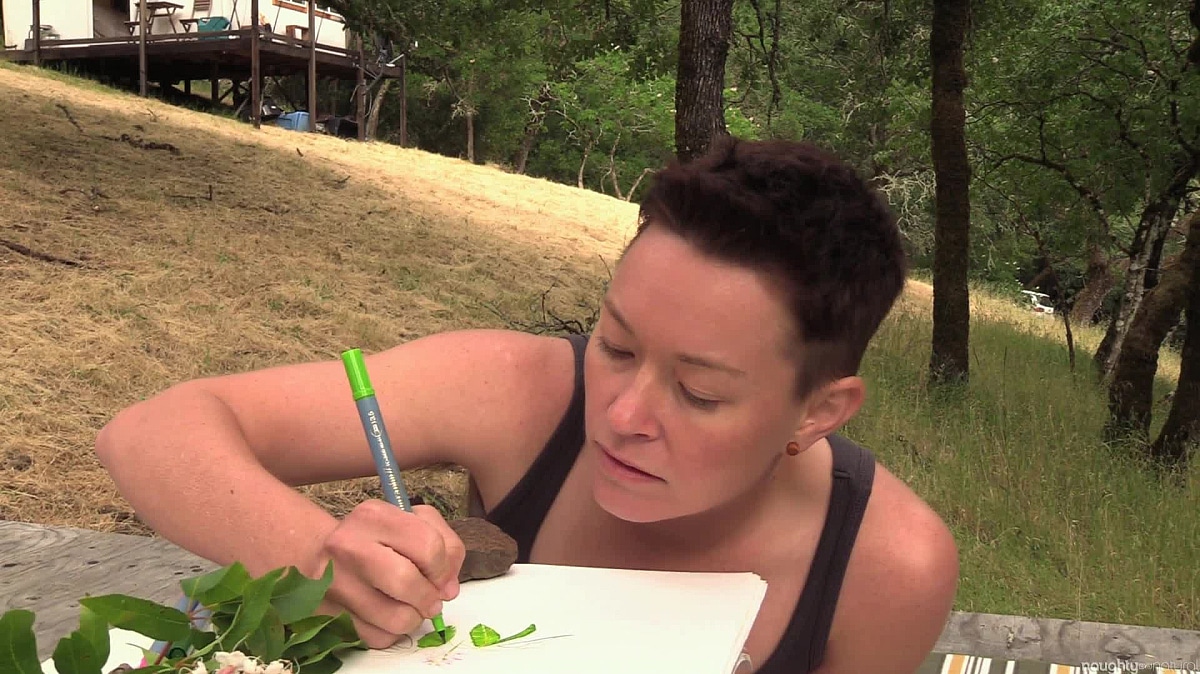 Jiz is really concentrating on their drawing but soon their mind starts to wander. They play with the paintbrush on their chest before moving it down and rubbing it in their bush and using it get themself off!