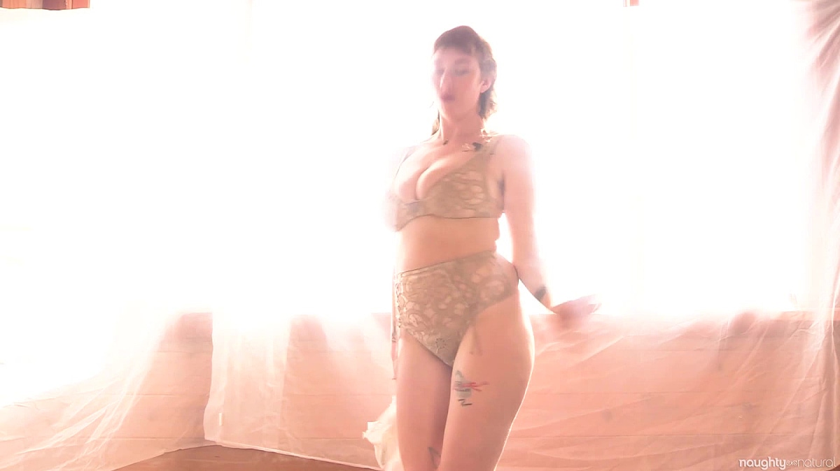 Vestacia dances in the sunlight before taking off her clothes to her reveal her generous, all natural breasts and big fluffy blonde bush.