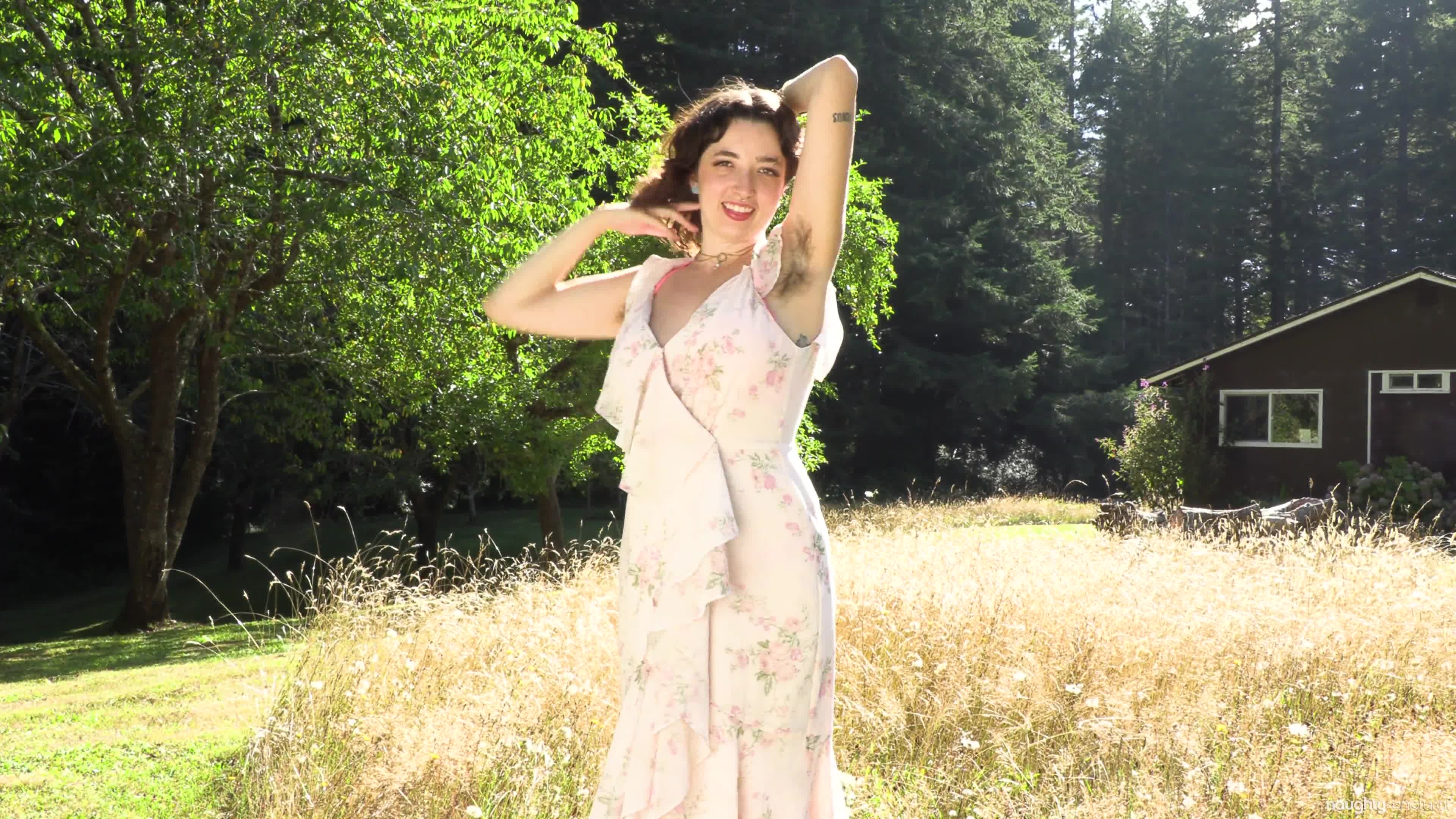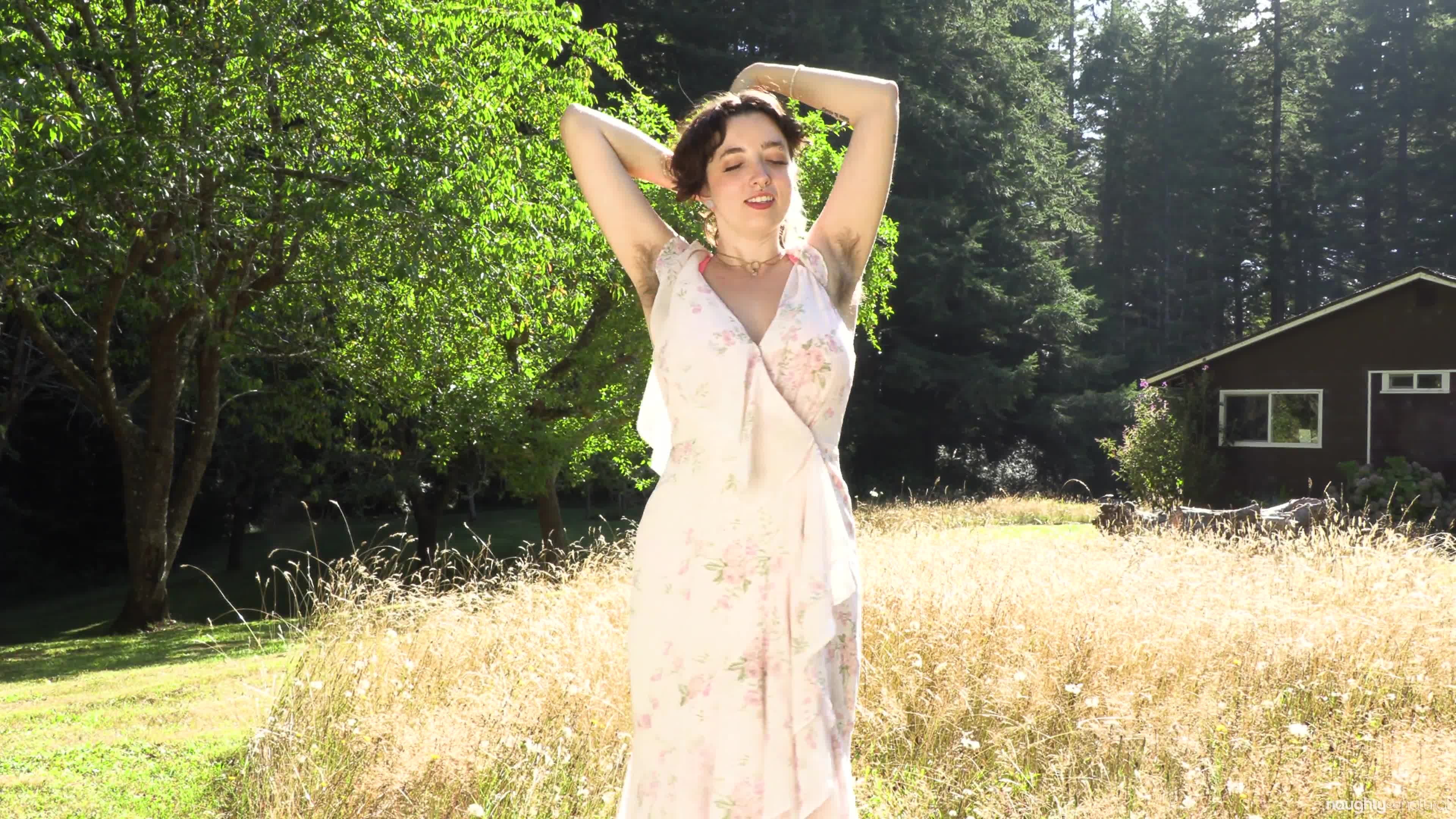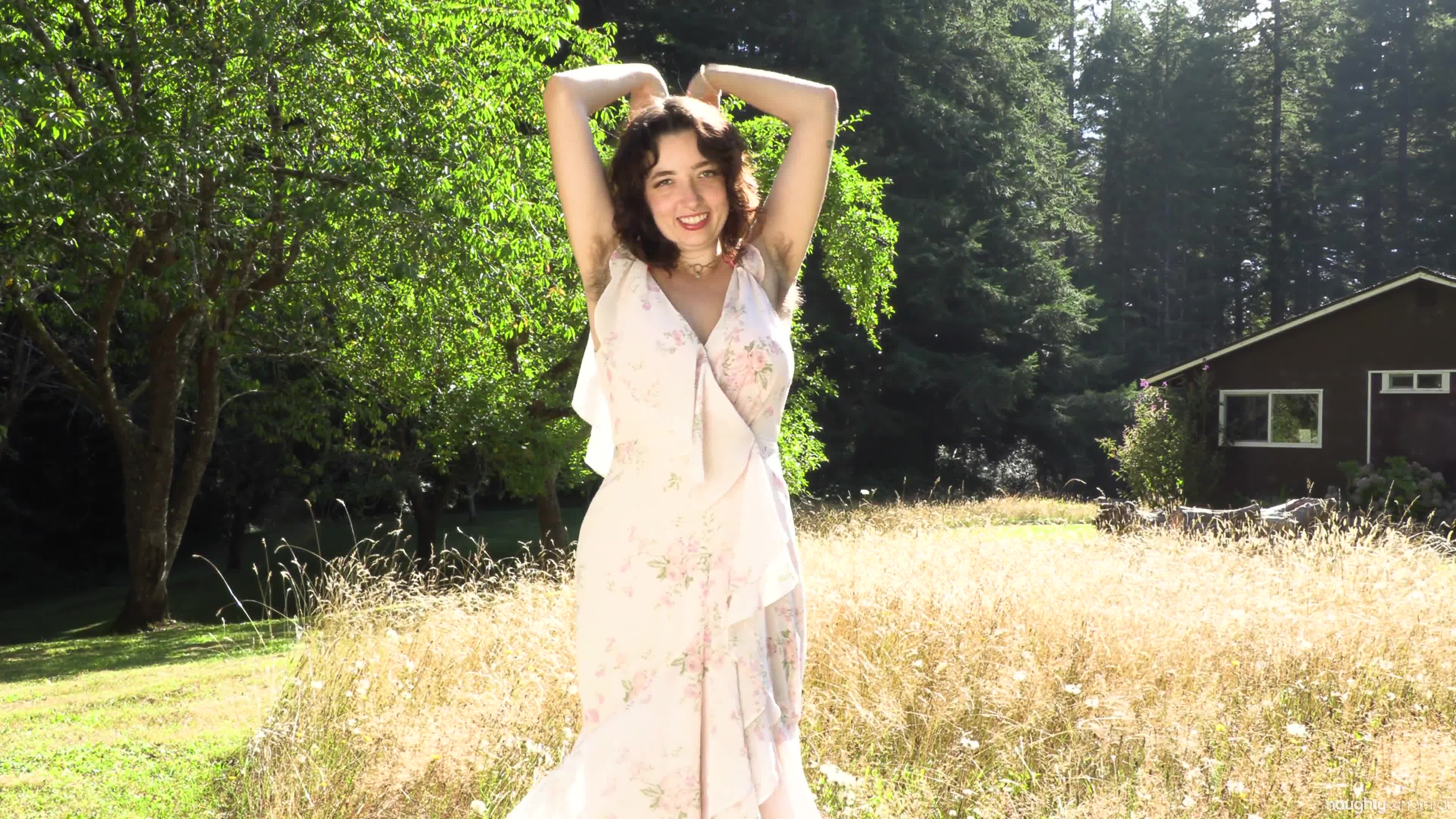 Kathrine teases you in her long flowing dress before stripping down to her hairy birthday suit to spread her bushy pussy in nature.