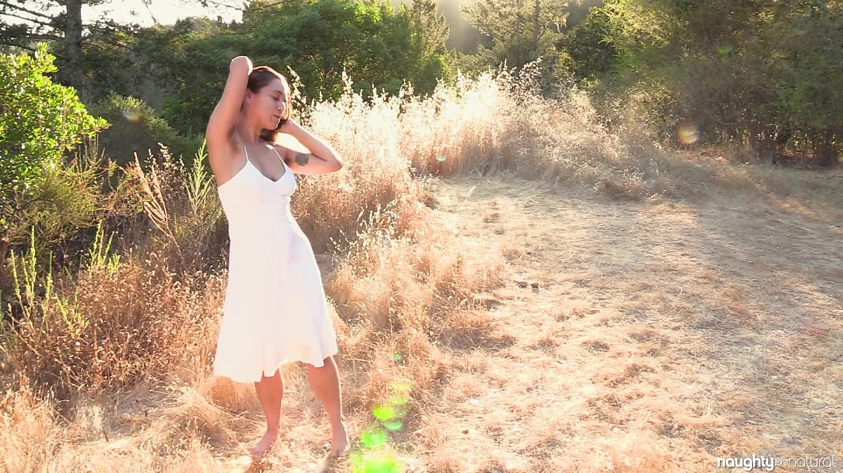 Zse Zse looks beautiful with her long hair and all natural body, moving in the sunlight golden field, getting naked and masturbating.
