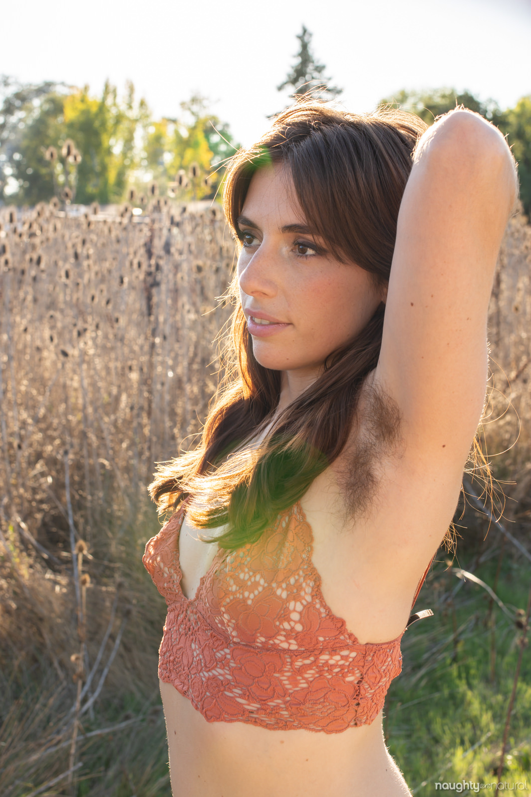 Simone looks beautiful, backlit in a field of teasel with her beautiful brunette hair glowing. Enjoy this long time model and site favorite showing off her gorgeous hairy arms, armpits, bush and legs. Join now to see all 358 photos in this scene!