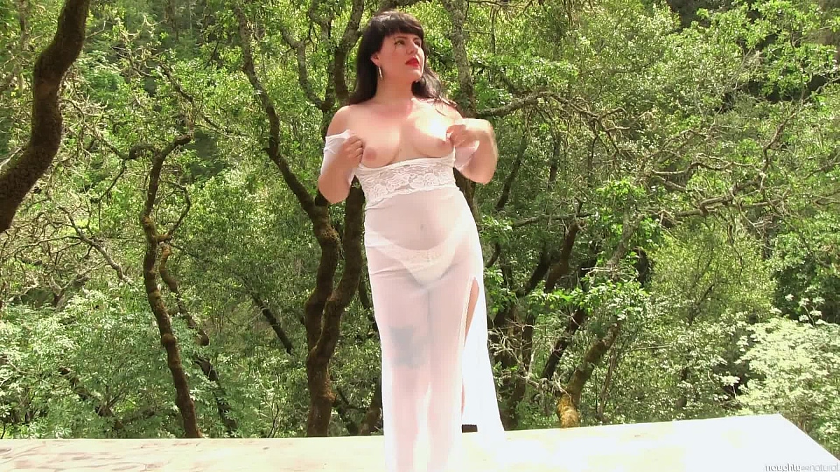 Olivia looks beautiful against this lush green background, her dark body hair on her pale skin and bright lips. She shows off naked and standing for a while before laying back to cum while looking up at the Oaks.