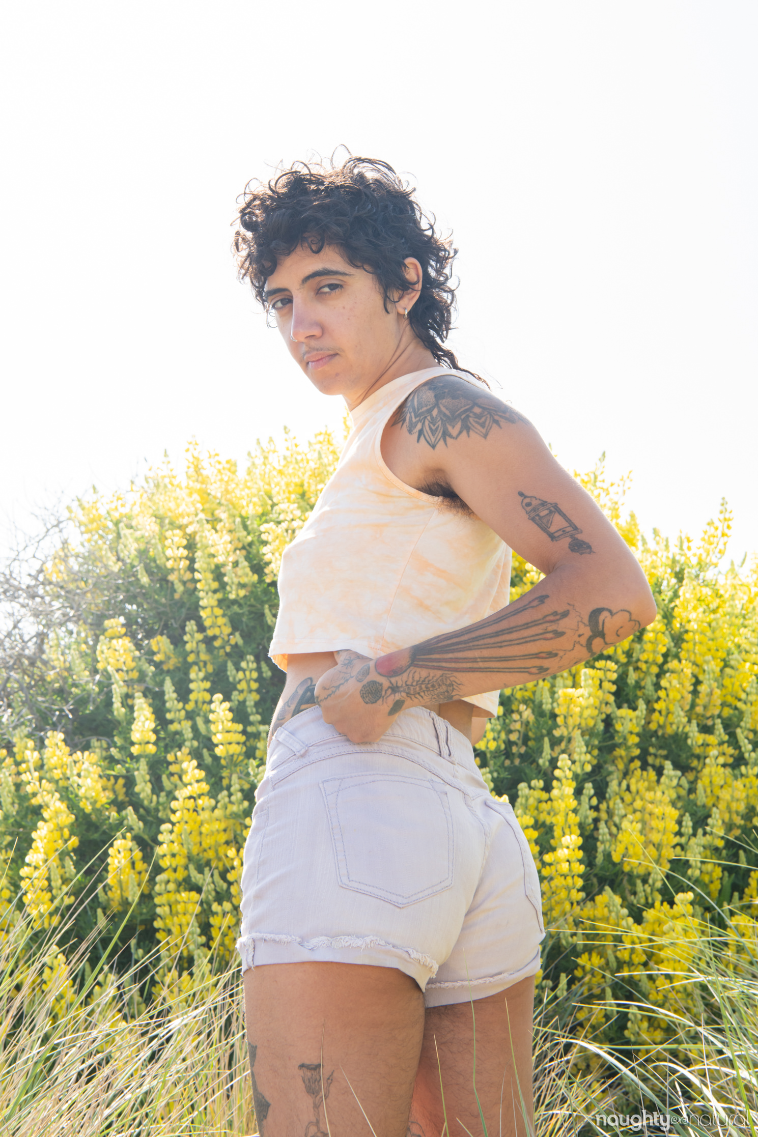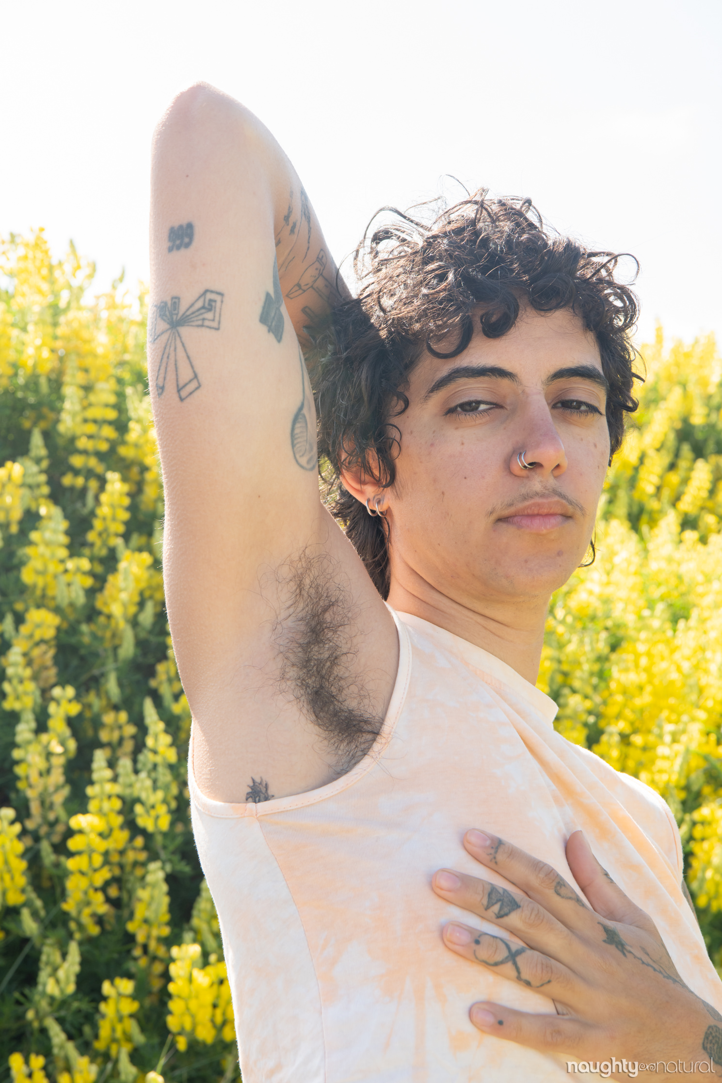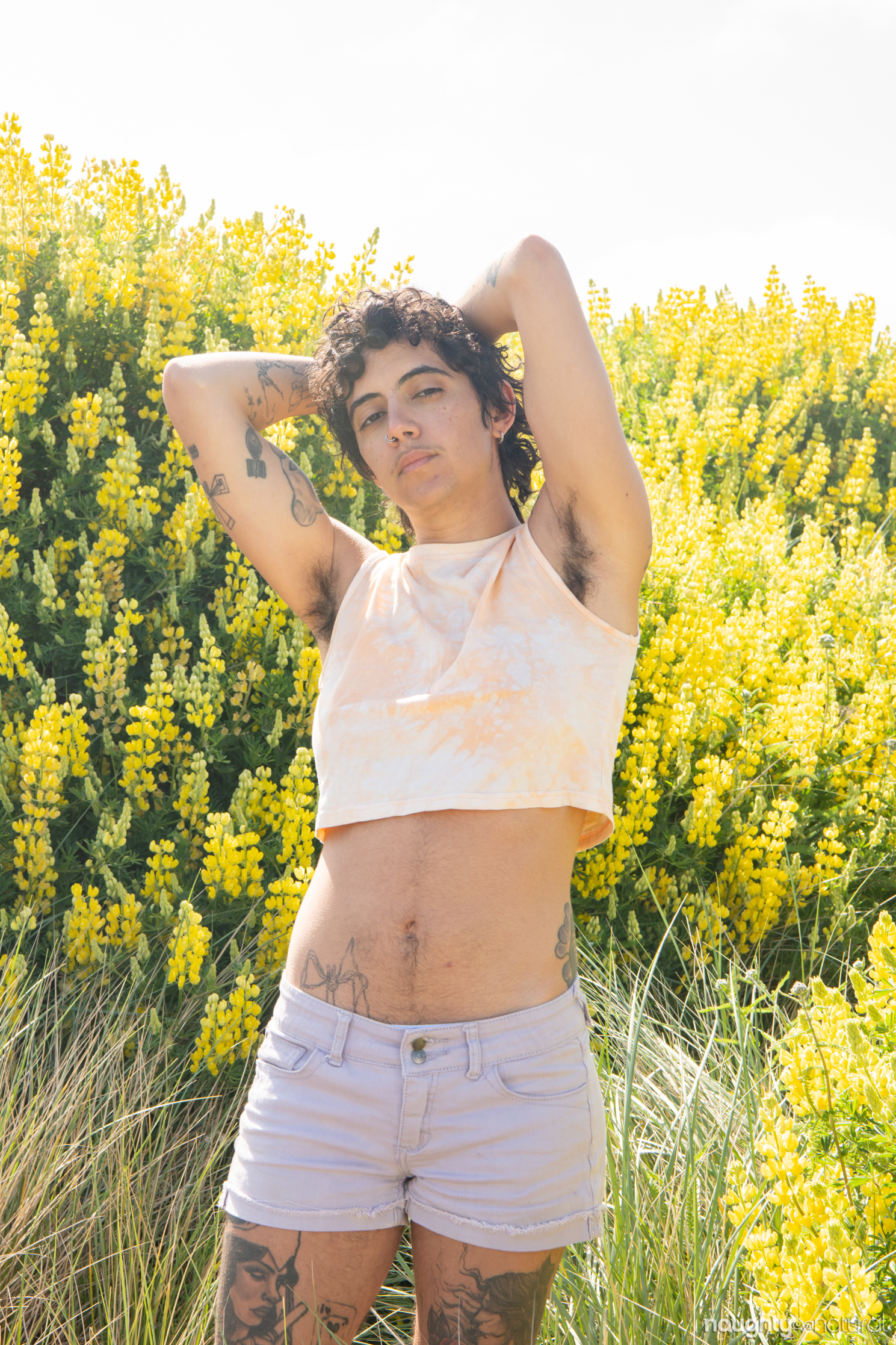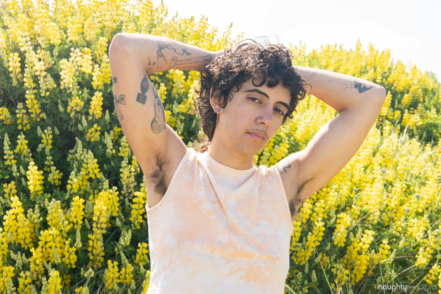 Zaki shows off their strong, hairy body at the beach. The backdrop of yellow lupin brings out their dark body hair in the best way, wouldn't you agree? Join now to see all 212 photos in this scene!